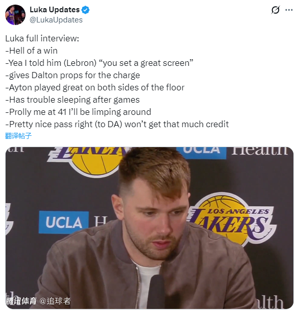 谈到了詹姆斯的表现时,东契奇开玩笑说道:我41岁的时候可能都得一瘸一拐走路了。