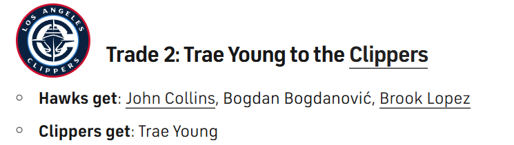 北京时间1月7日,据美媒HoopsHype报道,快船是密切关注特雷-杨的球队之一。那么,快船该如何得到特雷-杨,用哈登换他属实有些疯狂,CBS体育列出了一个更现实的3换1方案。具体如下——