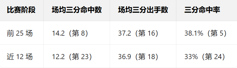 亚历山大的三分投射表现断崖式下滑,而他本赛季的场均三分出手数位列球队第三(4.9次),这一问题尤为突出。此外,全队的三分投射都出现了不同程度的滑坡。