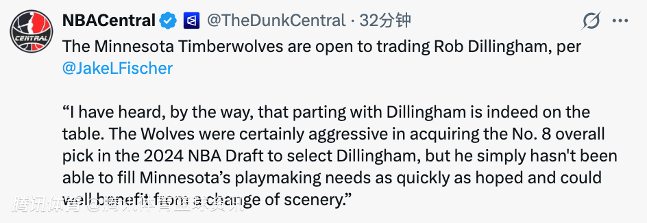 Fischer表示:“顺便提一句,我听说球队确实在考虑送走迪林厄姆。森林狼当初为了得到 2024年NBA选秀大会的8号签(原本是马刺的)选他,动作相当激进,但他没能像预期那样快速填补球队的组织空缺,换个环境或许对他更有利。”