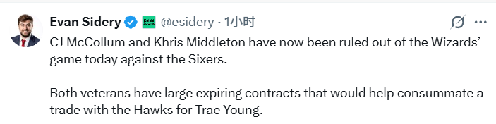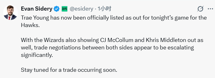 Sidery还表示,一笔交易或将很快达成。奇才这两位老将均持有大额到期合同,这将有助于促成奇才与老鹰关于特雷-杨的交易谈判,使薪资匹配更具可行性。
