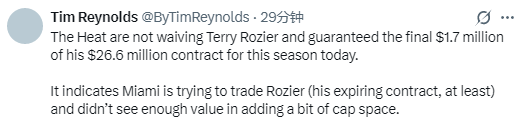 事实上,无论是否留下罗齐尔,热火队目前已有一个空缺的阵容名额,且拥有足够的薪资帽空间,若有意向均可签下一名标准合同球员。这表明热火方面正试图交易罗齐尔(至少是利用他即将到期的合同),且认为腾出第二个阵容名额以及额外170万美元的奢侈税线以下空间,而放弃利用罗齐尔即将到期的薪资合同参与潜在交易的机会,并不值得。