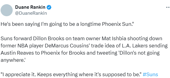 北京时间1月8日,太阳球星狄龙-布鲁克斯在球队训练结束后接受媒体采访,谈及此前老板伊什比亚反驳考辛斯湖人应该用里夫斯交易得到狄龙这一提议的话题。