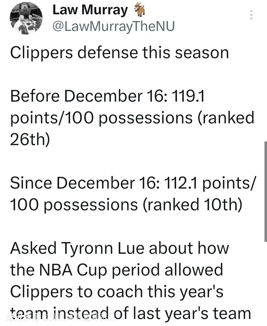 根据数据统计显示,快船在12月17日之前百回合失分119.1分(联盟排名第26位),而在12月16日至今,百回合失分112.1分(联盟排名第10位)。当被问及球队如何在NBA杯赛期间把防守调整到位时,泰伦-卢说道:“那段时间对我们至关重要。我常说要把功劳归功于球员们,感谢他们在困难时期依然坚持努力训练。”