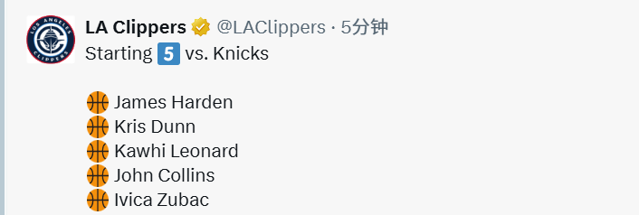 快船首发五人为:哈登、邓恩、莱昂纳德、祖巴茨、科林斯。