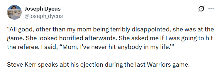 科尔表示:“一切都还好,就是我妈特别失望,她当时也在现场看比赛。赛后她那表情别提多惊愕了,还问我是不是要动手揍裁判。我跟她说:‘妈,我这辈子从没打过别人。’”