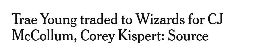 北京时间1月8日,亚特兰大老鹰队与华盛顿奇才队达成一笔交易:四届全明星控球后卫特雷-杨将加盟华盛顿,而奇才队的资深双能卫CJ-麦科勒姆与锋线球员科里-基斯珀特则将前往亚特兰大。