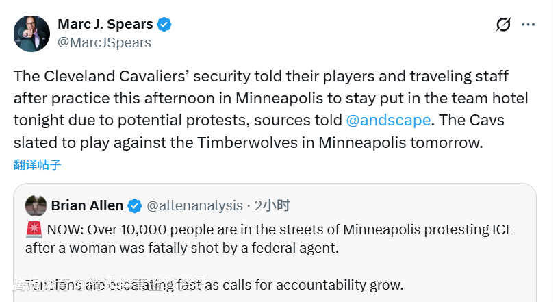 北京时间1月8日,根据NBA名记Marc J.Spears在个人社交媒体上报道,克利夫兰骑士队安保人员在今日球队于明尼阿波利斯的训练结束后,已告知队内球员及随行工作人员,鉴于当地可能爆发抗议活动,今晚需留守球队下榻酒店。