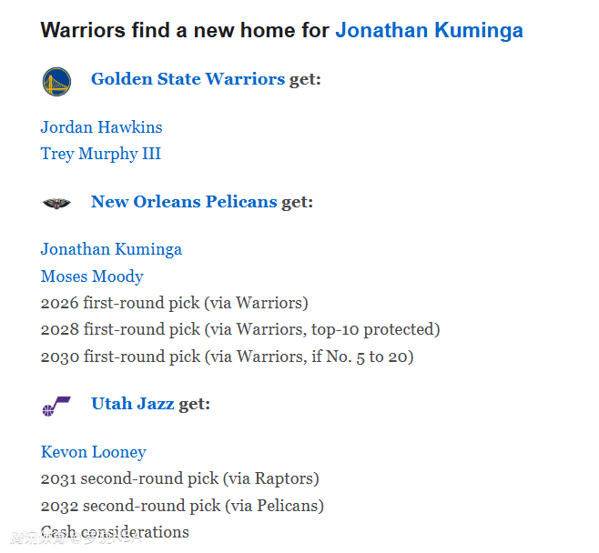 由于鹈鹕队并不急于送走墨菲,勇士队想要得到上述这些利好,势必需要付出代价。这笔交易中,勇士队将送出自己可交易的四个首轮签中的多达三个(其中一个是无保护)。鹈鹕队则需要承担一定风险:这笔交易最终可能只得到一个首轮签,但如果勇士队战绩下滑,他们最多能收获三个乐透签。