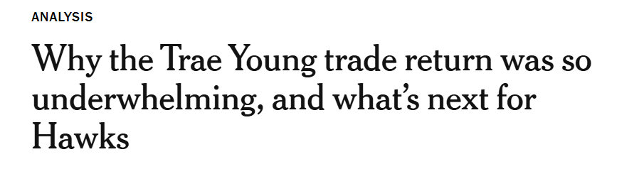 然而,即便早在老鹰试图拆散特雷-杨与德章泰-穆雷这对毫无化学反应的组合时,联盟中就没有任何球队愿意为得到杨而向老鹰送出重磅筹码。杨固然是联盟中最具活力的进攻核心之一,但其他球队对他的兴趣始终不温不火。