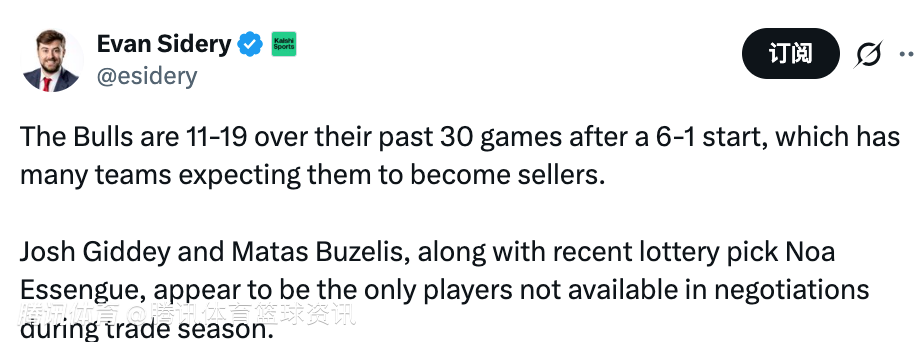 北京时间1月9日,NBA常规赛,公牛队在赛季开局6胜1负后,过去30场比赛仅取得11胜19负的战绩,这让多支球队认为他们会在交易截止日前成为“卖家”。
