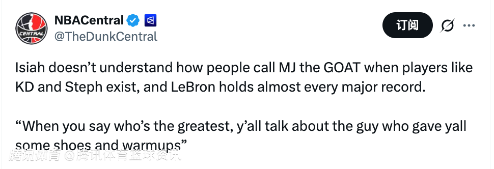 “好,然后你们转过头看看现在的时代。詹姆斯就坐在那里,他手握每一项篮球纪录,我是说每一项纪录!你们看着杜兰特,你们看着库里,为什么还有人把乔丹称作GOAT?当你们被问到谁是最伟大的球员时,你们只会谈论那个给你们送过球鞋、热身服、在这个节目里给过你们体育票的家伙。”