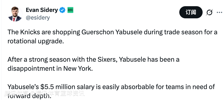 北京时间1月9日,据美记Evan Sidery报道,尼克斯正计划在交易截止日前兜售亚布塞莱,以升级轮换阵容。