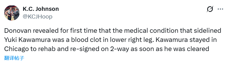 北京时间1月9日,据公牛队记K.C.约翰逊报道,公牛队10月裁掉双向合同后卫河村勇辉的伤病原因,是其右小腿出现血栓。本周早些时候,球队已重新签下河村勇辉。