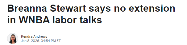 北京时间1月9日,WNBA纽约自由人队球星、球员工会(WNBPA)副主席布里安娜-斯图尔特表示,若本周六的截止日期结束后双方仍未达成协议,球员工会与联盟将不会再续签新的劳资协议延期条款。届时双方将进入“现状维持期”,在此期间现行劳资协议继续生效,联盟与工会可继续展开谈判。