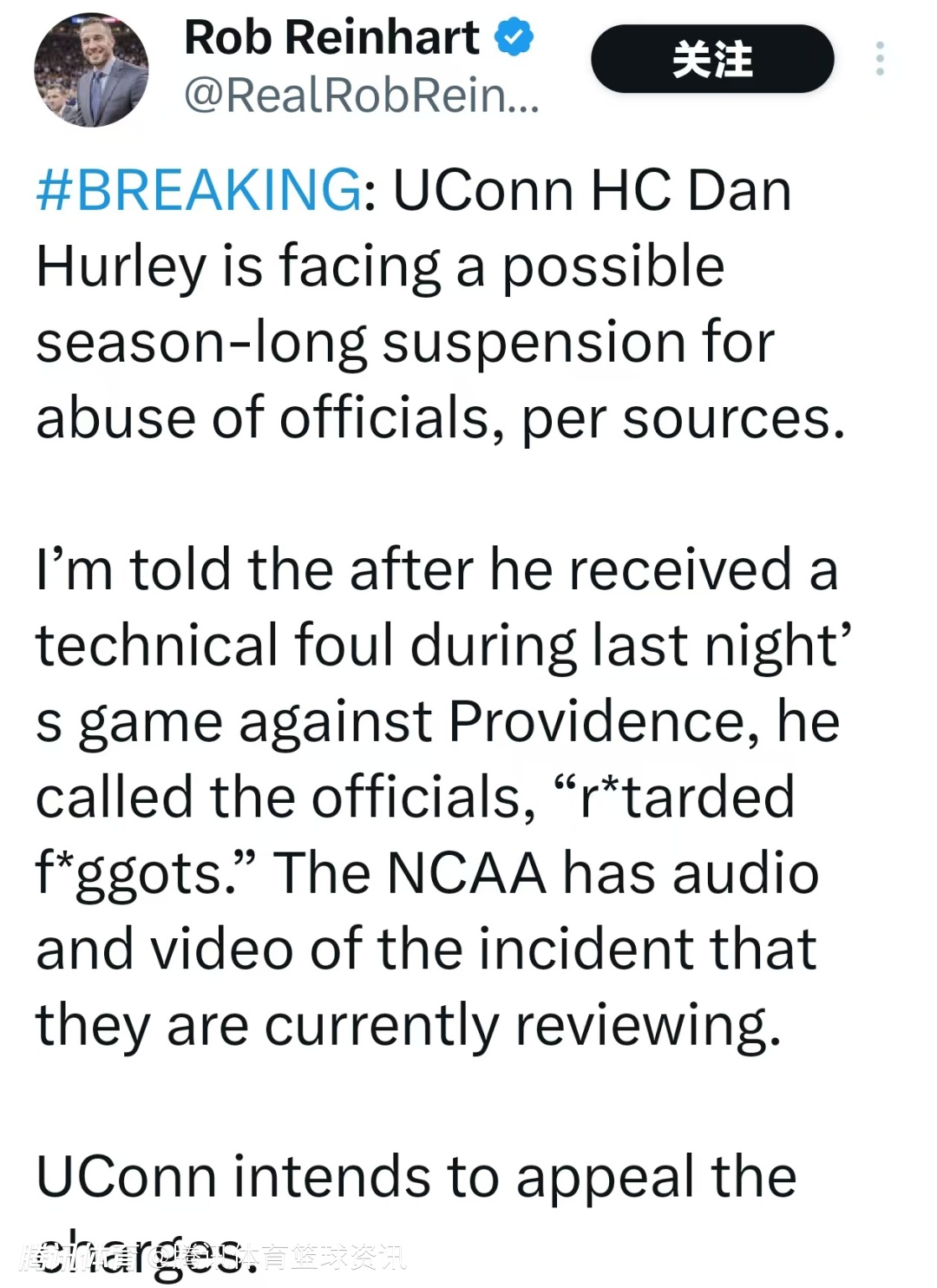 据悉,在昨晚对阵普罗维登斯学院的比赛中吃到技术犯规后,赫尔利称裁判为“智障基佬”。NCAA目前已掌握该事件的音视频证据并正在审查中。康涅狄格大学方面打算对这一指控提出上诉。