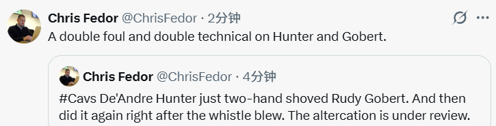 从慢动作回放来看,当时森林狼队投篮不中,亨特在篮下卡位,而在他身后的戈贝尔也试图冲抢前场篮板。双方在卡位中肢体都有动作,戈贝尔抓住了亨特的球衣,而亨特则不满戈贝尔的动作,将其一把推开。而在裁判哨响之后,亨特又推了一把戈贝尔。