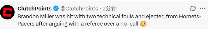 北京时间1月9日,NBA常规赛继续进行,步行者队对阵黄蜂队。本场比赛进行到第三节,布兰登-米勒因不满裁判没吹犯规,而领到个人第二次技术犯规,被驱逐出场。