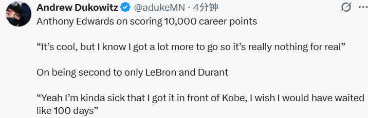 在谈到自己的里程碑时,爱德华兹说道:“这事儿挺酷的,但我心里清楚,我的路还长得很,所以说实话,这根本不算什么。”在得知自己超过了科比,成为詹姆斯和杜兰特后最年轻的10000分先生时,爱德华兹说道:“说真的我有点小郁闷,我这10000分里程碑竟然是在科比的纪录前面达成的。我真宁愿再多等100天。”