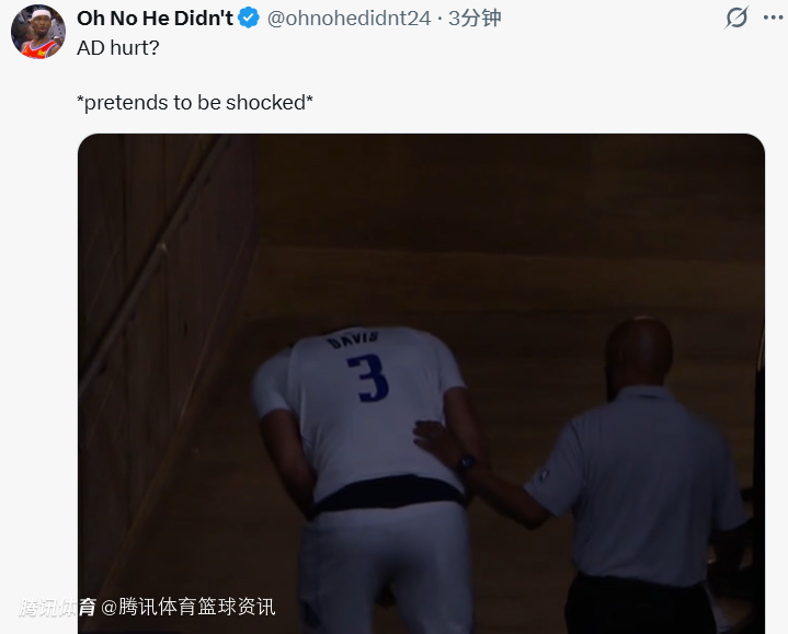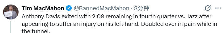 NBA记者麦克马洪在个人推特上写道:“在对阵爵士的比赛第四节还剩2分08秒时,安东尼-戴维斯疑似左手受伤离场,离场后在球员通道内因剧痛俯身弯腰。”