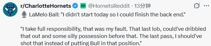 在谈到新秀赛季以来第一次替补如何调整心态时,鲍尔说道:“就是放平心态、保持开放的态度而已。我们所有人的目标都是赢球,所以现在做的就是当下能找到的最优解。其实我没做任何改变。说到底,篮球比赛的本质都是一样的。上场也好,没上场也罢,只要踏上球场,对我来说就没什么不一样的。”