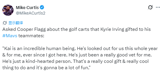 北京时间12月18日,独行侠新秀弗拉格在接受媒体采访时,谈及欧文为独行侠队友赠送高尔夫球车一事。