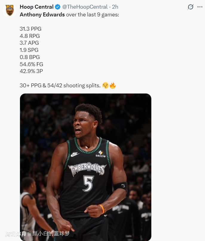 过去的9场比赛,爱德华兹场均31.3分4.8篮板3.7助攻1.9抢断0.8盖帽,命中率54.6%,三分命中率42.9%,狼王狂妄是狂妄但他就是有狂妄的本钱。