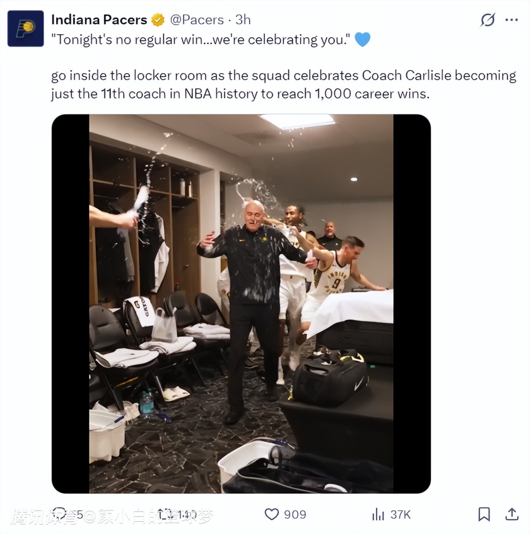 这场比赛的赛后步行者全队在更衣室疯狂为卡莱尔庆祝,他们都朝着卡莱尔浇水庆祝,全队都洋溢着喜悦的气氛,或许球队所有人都知道这个赛季他们是有意放弃的,卡莱尔的千胜来的迟了一点但虽迟但到。