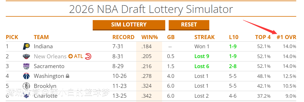 目前步行者7胜31负他们的状元签概率14%联盟第一,前四顺位概率52.1%,这个赛季步行者早已放弃,他们多人遭遇伤病只能待时而动,目前马瑟林、内姆布哈德、托平、以赛亚-杰克逊、哈利伯顿都在伤病名单上。