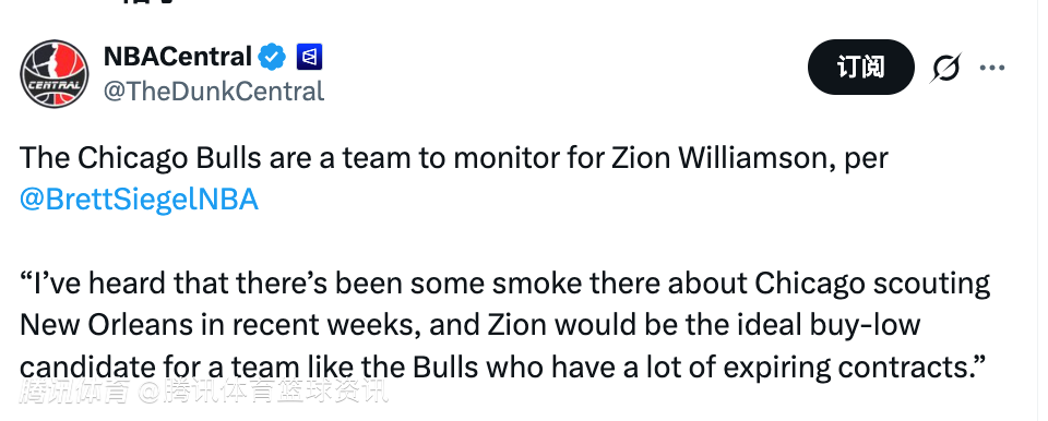 Siegel表示:“我听说最近几周有消息称,公牛队在考察鹈鹕队,而锡安会是公牛这种拥有大量到期合同的球队的理想‘低价位捡漏’目标。”