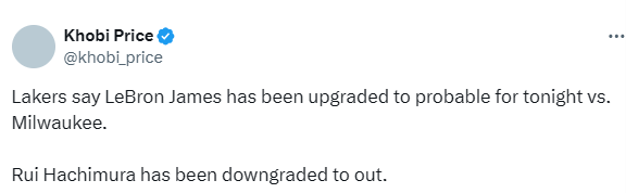 湖人更新伤情如下:八村垒(左小腿拉伤)降级为缺席比赛,詹姆斯(左脚关节炎及右侧坐骨神经痛)升级为大概率出战。