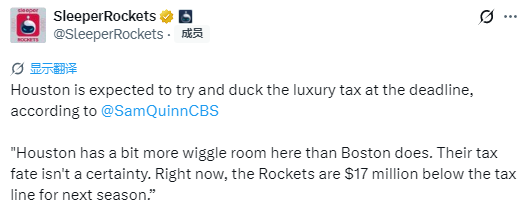北京时间1月10日,据CBS体育记者Sam Quinn报道,火箭有望在交易截止日前完成操作,避开奢侈税缴纳。