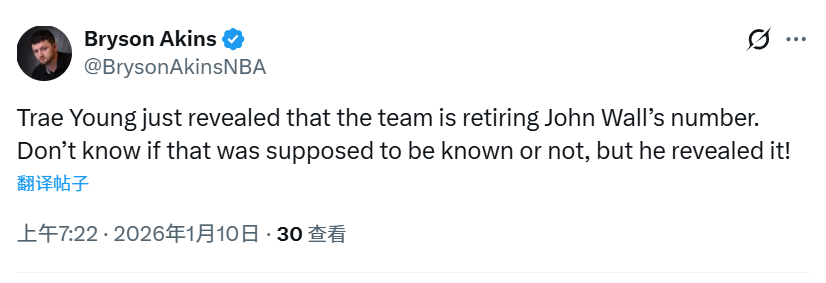 采访中,作为奇才的新面孔,特雷-杨还顺带爆了个料,他提到奇才计划退役沃尔的2号球衣。多位记者转发并感谢了特雷-杨的爆料。