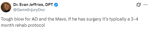 美记者Evan Sidery表示,独行侠原本希望在交易截止日期前送走浓眉,但这次受伤将正式结束这些交易谈判,直到休赛期才会重启交易。