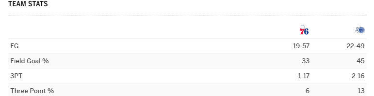 76人队的情况则更糟糕,上半场三分球总计17投1中,三分球命中率只有6%。唯一投中三分球的球员是格雷姆斯,他在上半场三分球3投1中,除了他之外,76人队剩余的球员三分球总计14投0中。