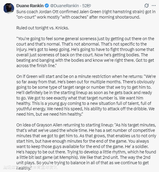 北京时间1月10日,NBA常规赛继续进行,太阳队对阵尼克斯队。赛前,太阳队主教练奥特接受媒体采访,谈到了杰伦-格林的伤病恢复情况。