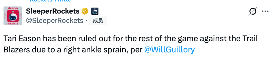 北京时间1月10日,NBA常规赛,火箭客场对阵开拓者,伊森遭遇脚踝扭伤,火箭官方宣布,伊森因为脚踝扭伤提前退赛,本场比赛不会回归。