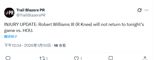 北京时间1月10日,NBA常规赛,开拓者主场对阵火箭的下半场,开拓者中锋罗威膝盖受伤退场。开拓者官方宣布,罗威因为右膝伤势,本场比赛不会回归。