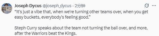 在谈到过去11场比赛勇士场均得到120分的表现时,库里直言:“想要得分,首先得把球投进,但更重要的是如何创造出投篮机会,以及球员们清楚自己的出手点在哪。同时,减少失误也是关键中的关键,失误少了,我们冲击篮筐的机会会更多,进攻篮板的拼抢也能占据优势。现在球队的一切进攻运转都渐入佳境,我们需要做的就是把这种状态保持下去。”