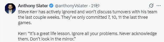 在谈到勇士如何解决失误问题时,科尔调侃道:“我现在绝口不提失误这个词,只会告诉大家稳扎稳打,也不会给球员们放糟糕的传球录像,就是彻底无视,跟鸵鸟埋头沙里一样。但这法子确实管用啊。说实话,这倒也算是个不错的人生教训:遇到问题直接无视,从来不承认它的存在,也不反思自己,正所谓无知是福嘛。”