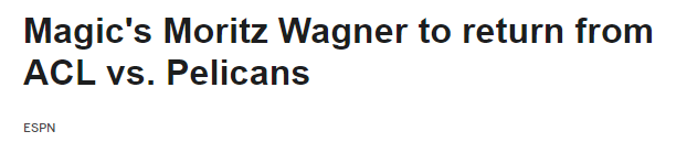 北京时间1月11日,魔术队官方发布公告,宣布球员莫里茨-瓦格纳已进入出战名单,将在1月12日对阵鹈鹕的比赛中迎来赛季首秀。