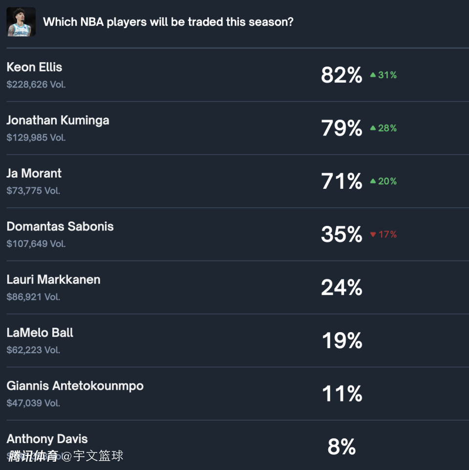 据数据网站Poly Market显示,目前浓眉在交易截止日前被交易概率只剩下8%,甚至不如此前公开向雄鹿表忠心的字母哥的11%。要知道,浓眉此前被交易概率一度高达60%,是全联盟被交易可能性最大的球员。