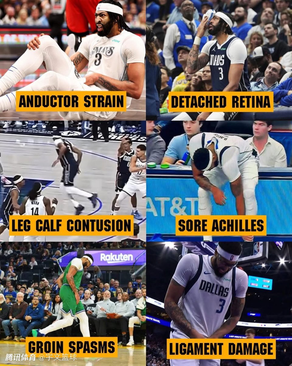 在加盟独行侠的11个月时间里,浓眉已经遭遇6次严重伤病,分别是内收肌拉伤(缺席18场比赛)、视网膜脱落(需要佩戴护目镜)、左小腿挫伤(缺席14场比赛)、跟腱酸痛(每日观察)、腹股沟拉伤(缺席2场比赛)、左手韧带损伤(归期未定),是名副其实的玻璃人。考虑到他今年将年满33岁,浓眉的伤病史不容被忽视。