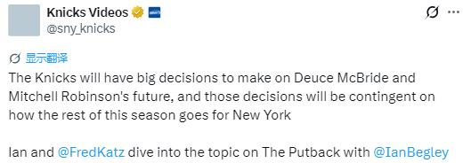 Begley表示:“麦克布莱德和米切尔-罗宾逊二人目前仍未完成续约。米切尔-罗宾逊如今已具备续约资格,我们都想知道,这两位球员的下一份合同会索要多少薪资,尼克斯方面又是否愿意匹配这个价位。”
