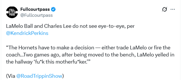 北京时间1月11日,篮球评论员帕金斯表示,据他了解,拉梅洛-鲍尔与黄蜂主帅查尔斯-李已出现严重意见分歧。