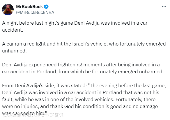 阿夫迪亚方面也发布声明回应此事:“在上一场比赛的前一晚,阿夫迪亚于波特兰遭遇了一场并非由他引发的车祸,他当时身处涉事车辆中。所幸此次事故无人受伤,感谢上帝,他目前状况良好,身体未受任何损伤。”
