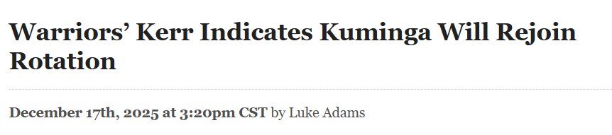 北京时间12月18日,勇士队主教练史蒂夫-科尔今日透露,经过三天休整,球队将于周五客场挑战菲尼克斯太阳队,届时库明加预计将重返轮换阵容。