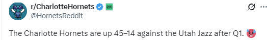 首节比赛,黄蜂队总计27投16中,三分球17投9中,鲍尔单节得到11分,米勒得到9分。爵士队24投6中,三分球7投0中。双方分差最大时一度达到33分。