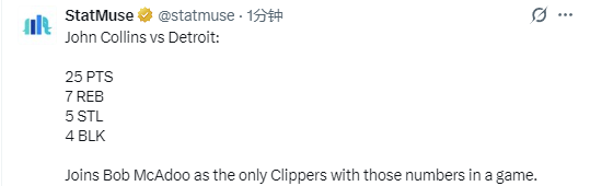 本场比赛,科林斯14投9中(三分球8投5中)得到25分7篮板1助攻5抢断4盖帽,在场正负值+19。根据数据统计显示,科林斯是NBA历史上首位能单场命中5+三分球、5+抢断和4+盖帽的球员。在快船队历史上,能单场得到25分7篮板5抢断4盖帽的球员,除了今日的科林斯,就只有鲍勃-麦卡杜能做到这点。本赛季,仅有2名球员能单场得到25分5抢断3盖帽,分别是科林斯和莱昂纳德,而莱昂纳德是上一次对阵活塞队时做到的这点。