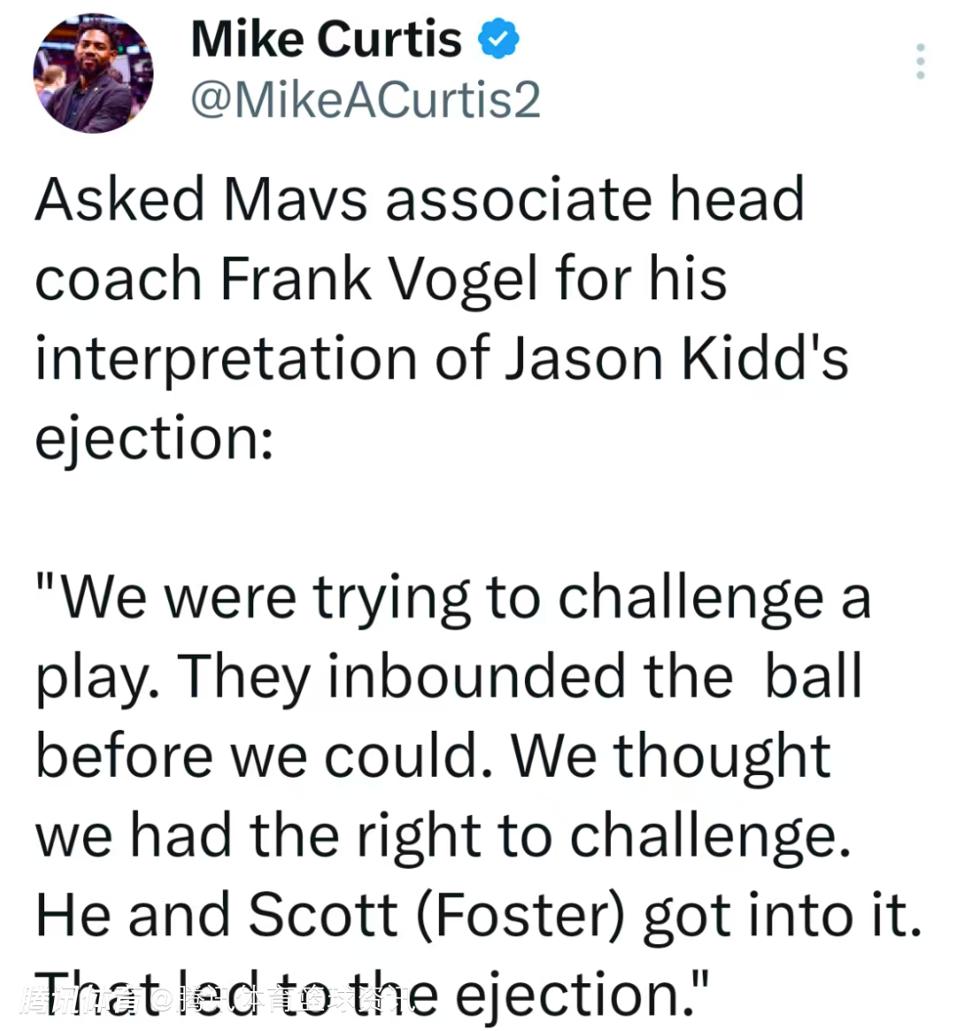 本场比赛第一节,克里斯蒂钉板封盖被吹干扰球,独行侠主帅基德抱怨裁判连吃2T被驱逐。对此,沃格尔表示:“我们当时试图挑战一个判罚,但对手在我们提出挑战前就完成了发球。我们认为自己有权发起挑战,基德和斯科特-福斯特因此发生了争执,这直接导致了驱逐。”